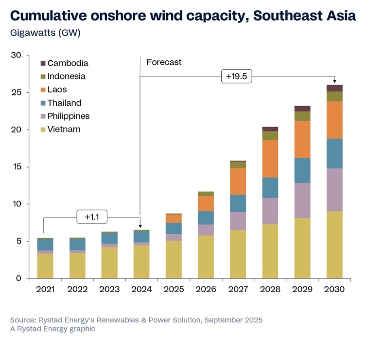 Southeast Asia’s onshore wind power sector, long hampered by regulatory obstacles and reliance on fossil fuels, is on the cusp of a major transformation, with capacity projected to quadruple from 6.5 gigawatts (GW) in 2024 to 26 GW by 2030, according to a new analysis by Rystad Energy.