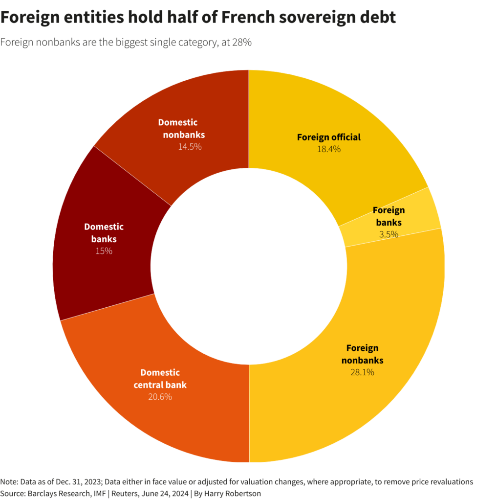 At the same time, foreign ownership of French debt is dangerously high, with more than 50% of long-term government bonds being held abroad.