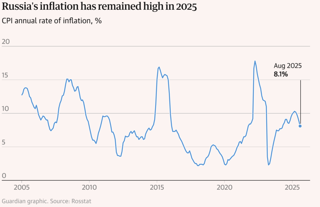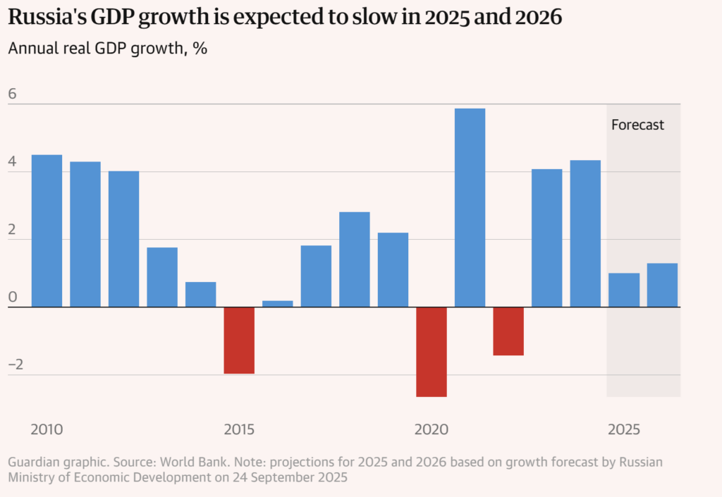 In both July and August of 2025, Russia’s GDP was just 0.4% higher than a year earlier. Surveys of businesses show contraction across manufacturing and services. Corporate profits are weak, and the stock market has lost its energy.