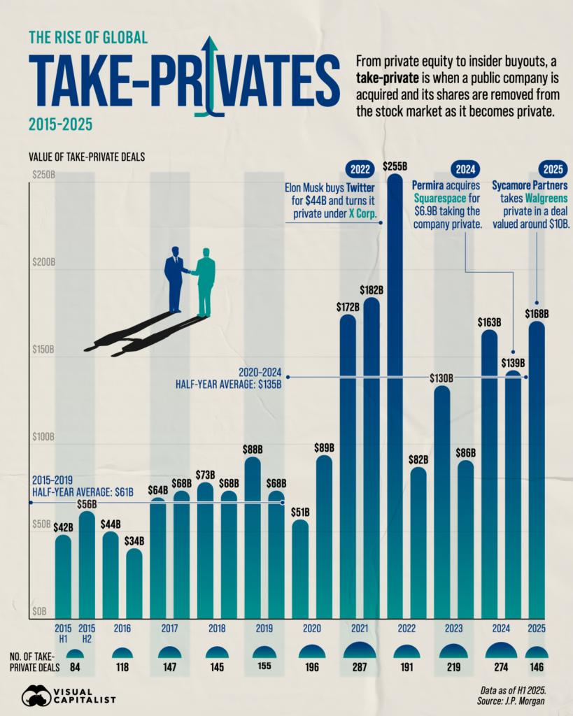 According to J.P. Morgan, the value of take-private transactions has more than doubled since 2019, from a half-year average of $61 billion to $135 billion between 2020 and 2024. This surge is one of the sharpest changes in ownership in decades, with a growing share of listed companies disappearing from public markets.