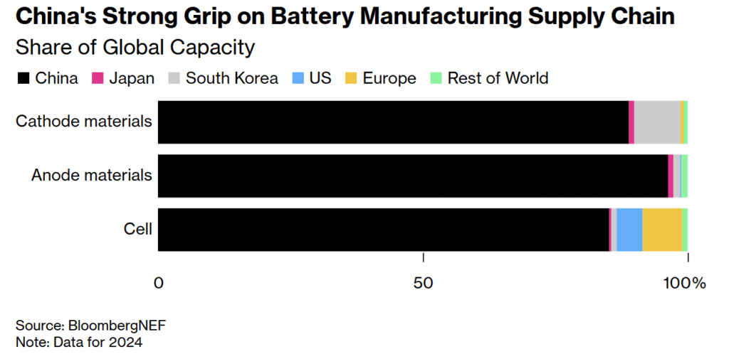 Data from Bloomberg shows that China produces about 96% of the world’s anode materials, 85% of its cathodes, and roughly 90% of rare earth minerals used in everything from wind turbines to missiles. Around 65% of US grid-scale battery imports this year have come directly from China.