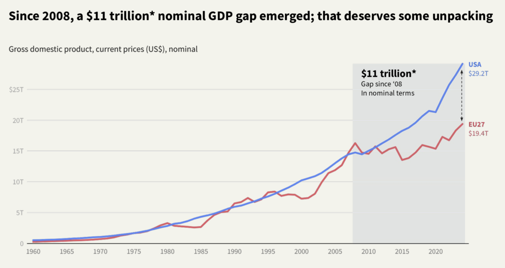 The United States tends to do this better than Europe because its labor and product markets are more flexible. In fact, a $11 trillion gap has been created between the US and Europe over the past 17 years.