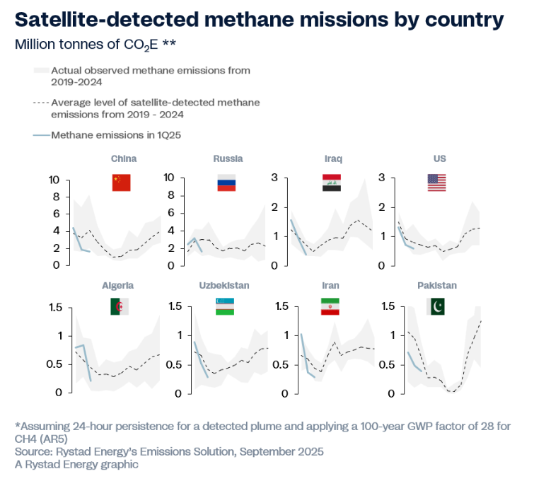 Methane emissions from the onshore upstream oil and gas sector, detected globally by satellites, showed an increase in late 2024 and early 2025, Rystad Energy said.