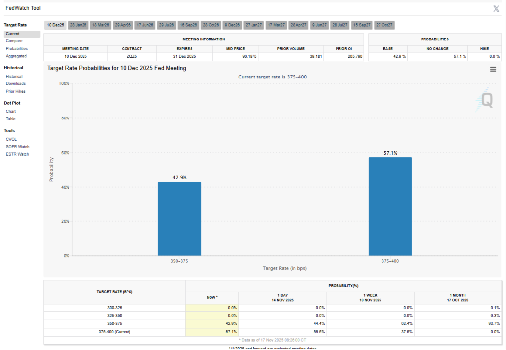 Policymakers’ recent cautious statements have caused the probability of a December rate cut to fall to 43% (down from over 62% last week), according to the CME FedWatch tool.
