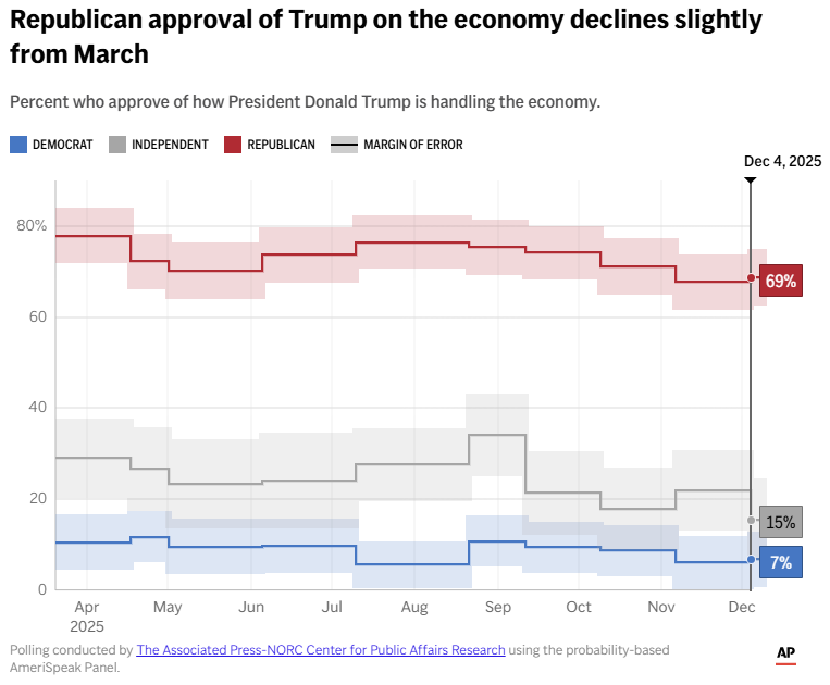 Approval ratings show a similar pattern. An AP NORC poll shows only 31% of Americans approve of Trump’s handling of the economy, the lowest economic rating of either of his terms.