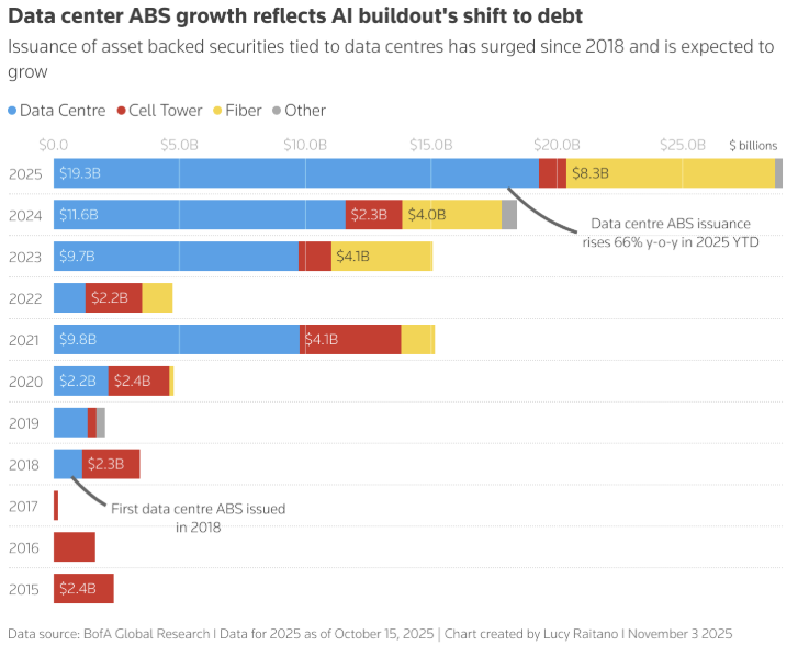 Securitisation adds another layer. Data centre cash flows are being bundled into asset-backed securities.