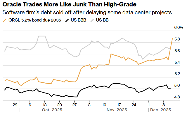 Oracle’s investment-grade bonds, including $18 billion issued in September, have sold off sharply. Paper losses now exceed $1 billion. Credit default swap spreads have risen to levels last seen during the financial crisis.