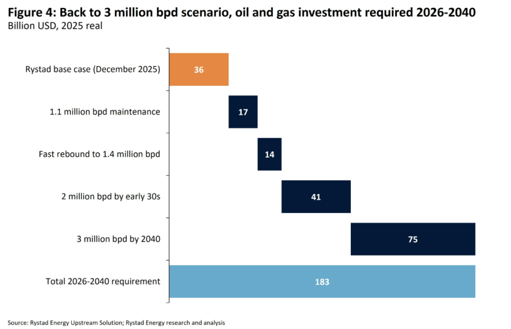 “Based on our assessment and expected project timelines, it could take around 15 years to get back to 3 million bpd, so production can return to late 1990s levels by 2040 if the new investment cycle starts as early as 2026,” Rystad Energy analysts said in their latest research.