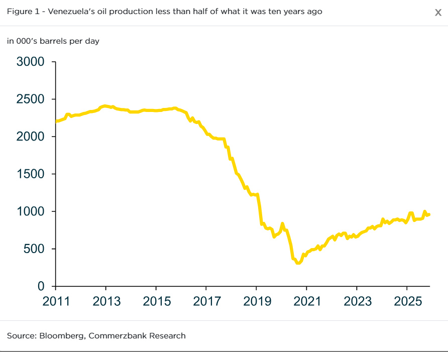 Additionally, the existing decline in Venezuela’s oil production, preceding the regime change, suggests that a V-shaped recovery in output is unlikely.