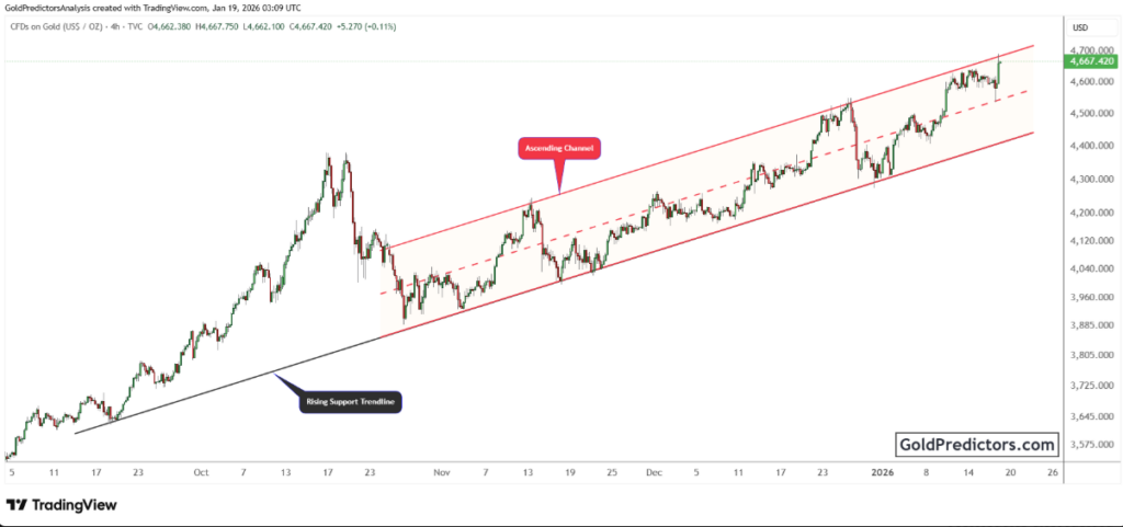 Gold is likely to inch higher gradually towards the upper boundary of a steep ascending channel near $4765 and projections around $4850.