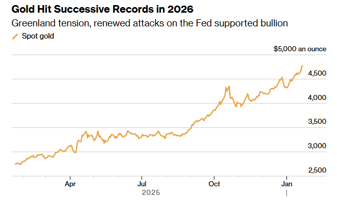 Perhaps the clearest message is coming from gold. Prices pushed above $4,850 an ounce, setting new records. Silver and platinum followed.