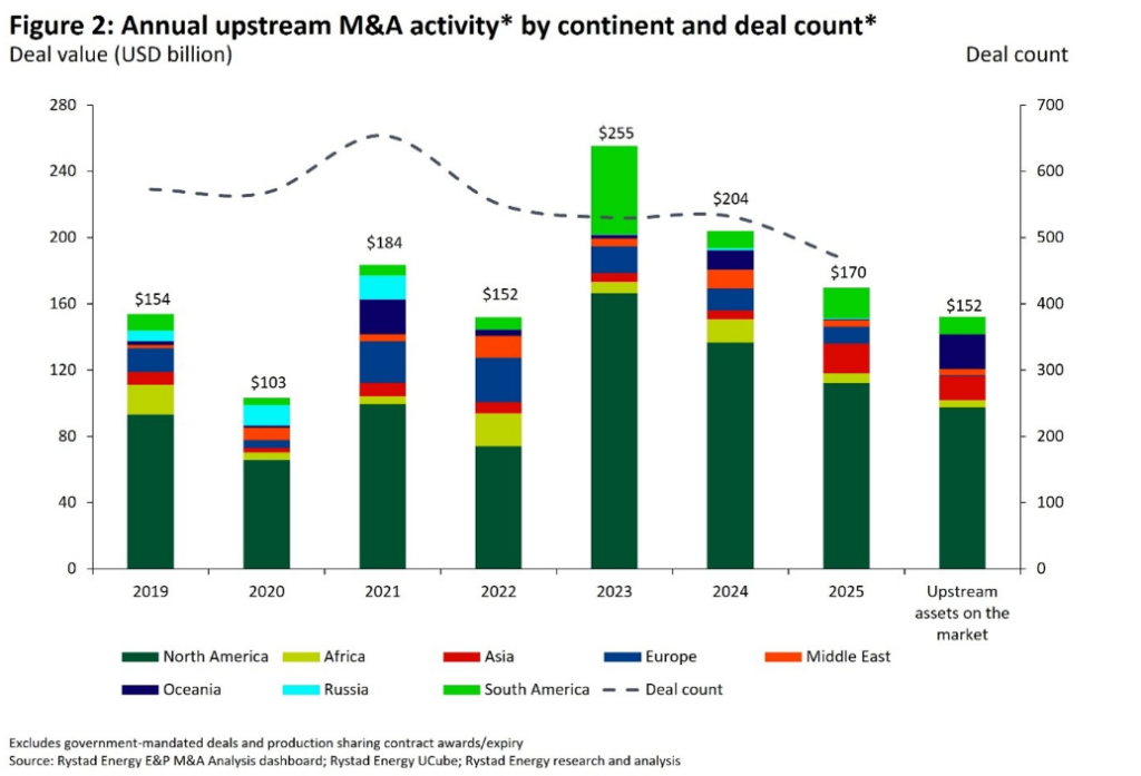 In 2025, global upstream Mergers & Acquisitions (M&A) activity decreased by 17% year-on-year (YoY), totaling approximately $170 billion.