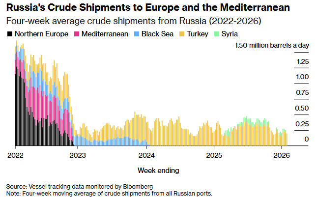 India, however, has started to pull back. Imports fell to around 1.12 million barrels per day in January, the lowest level since late 2022.