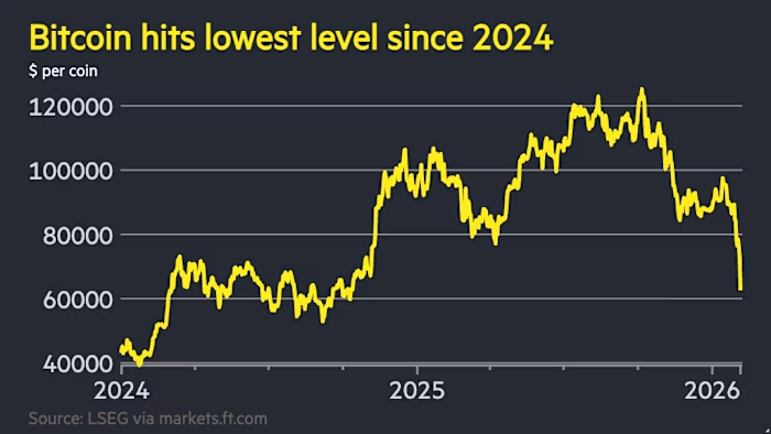 Bitcoin lost nearly half its value from the October 2025 peak near $125,000 to the low $60,000s as of early February.